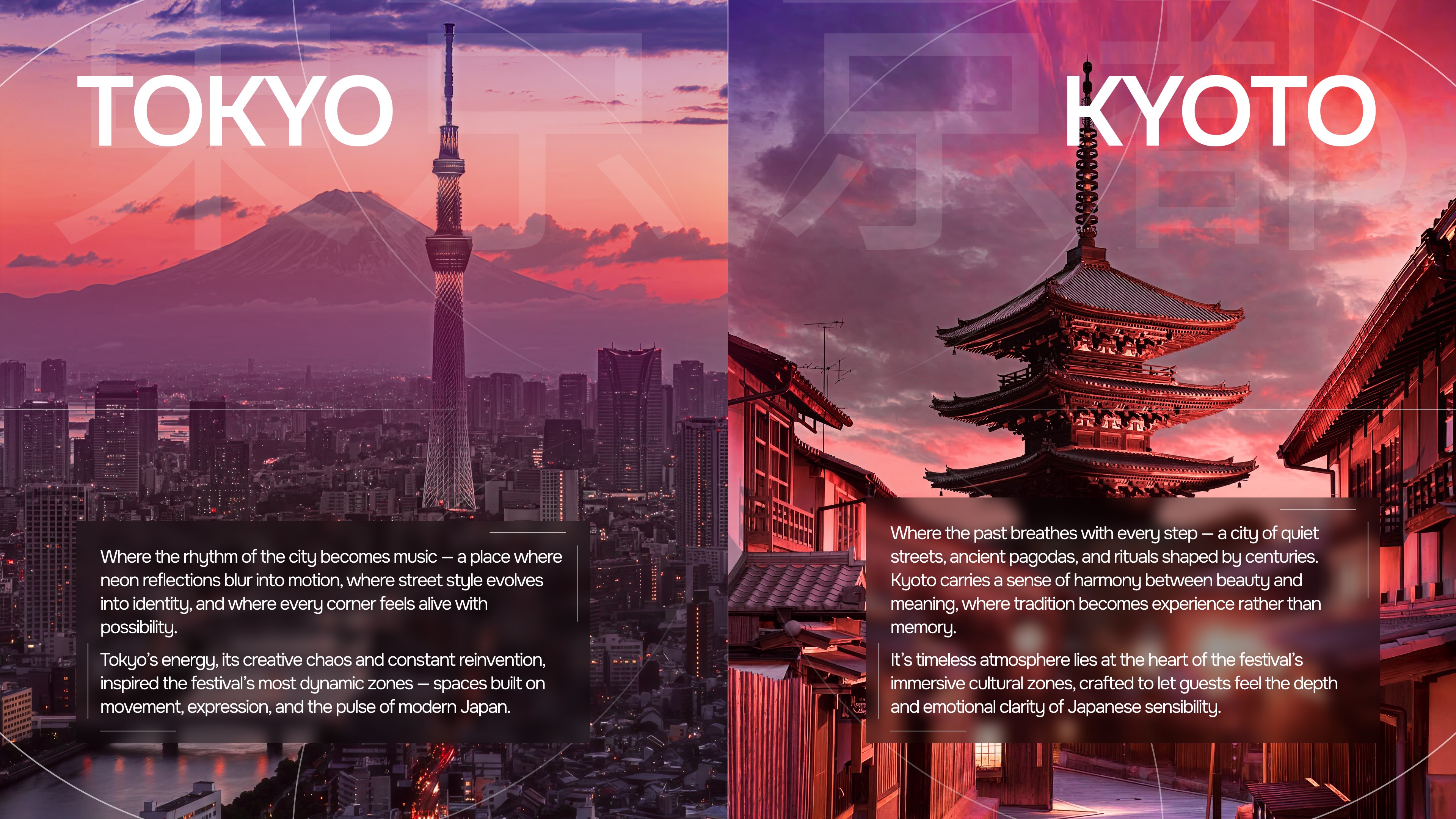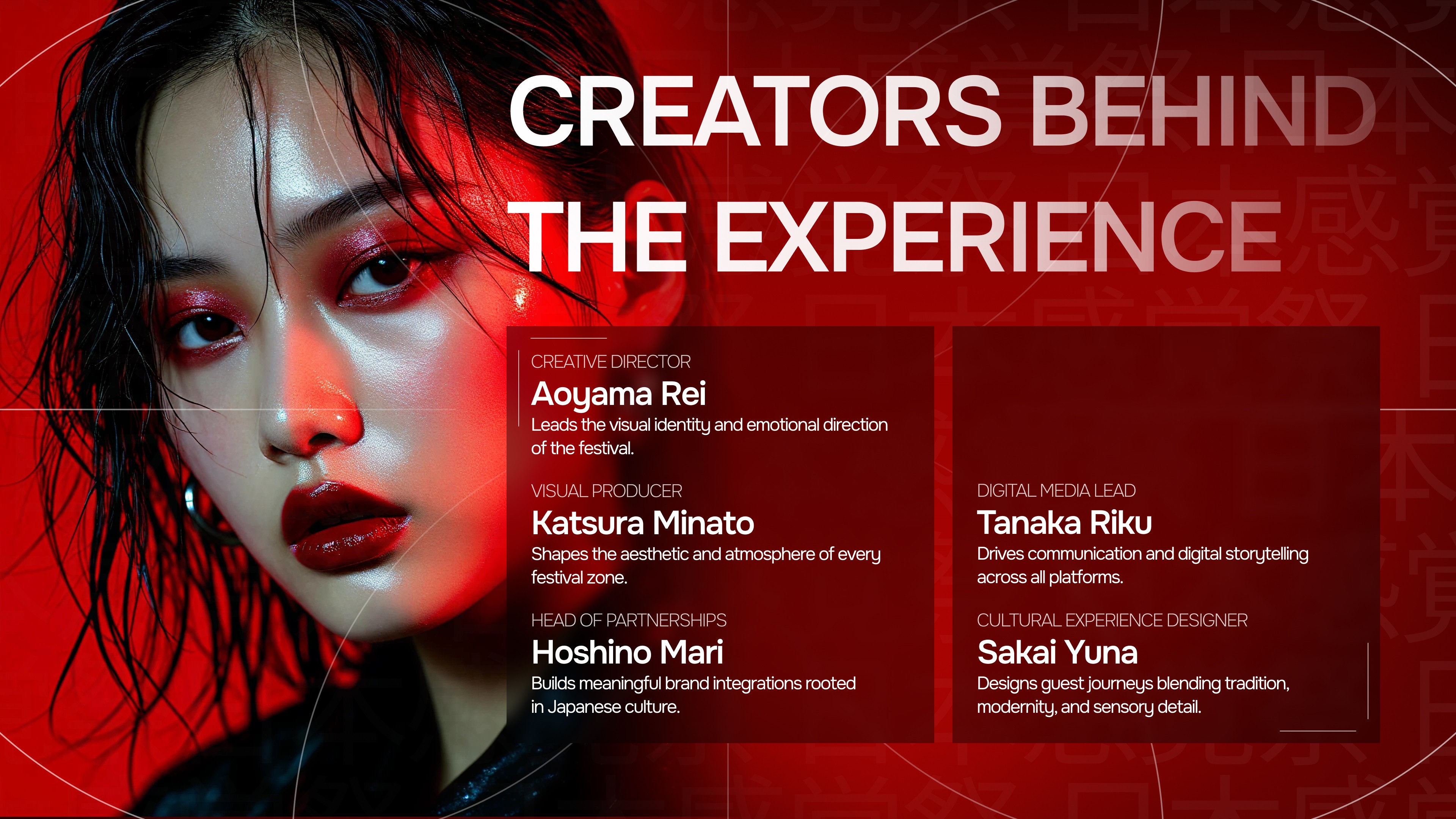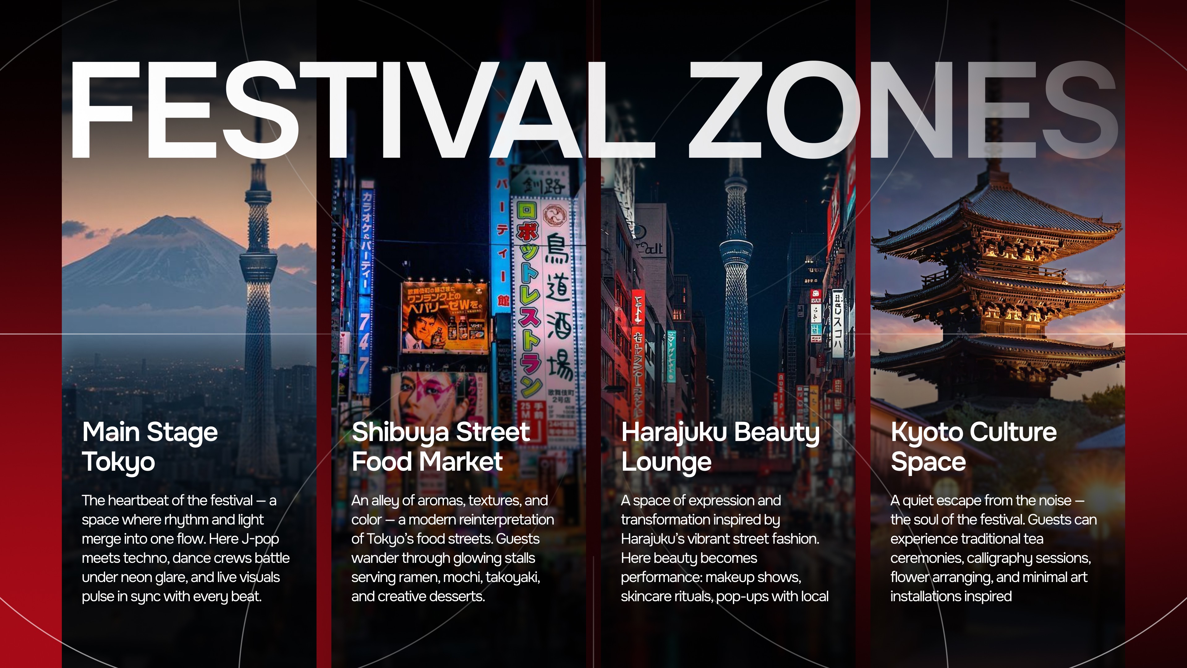 Разработать спонсорскую презентацию фестиваля в японской стилистике и показать его структуру, атмосферу и ценность для партнёров.
